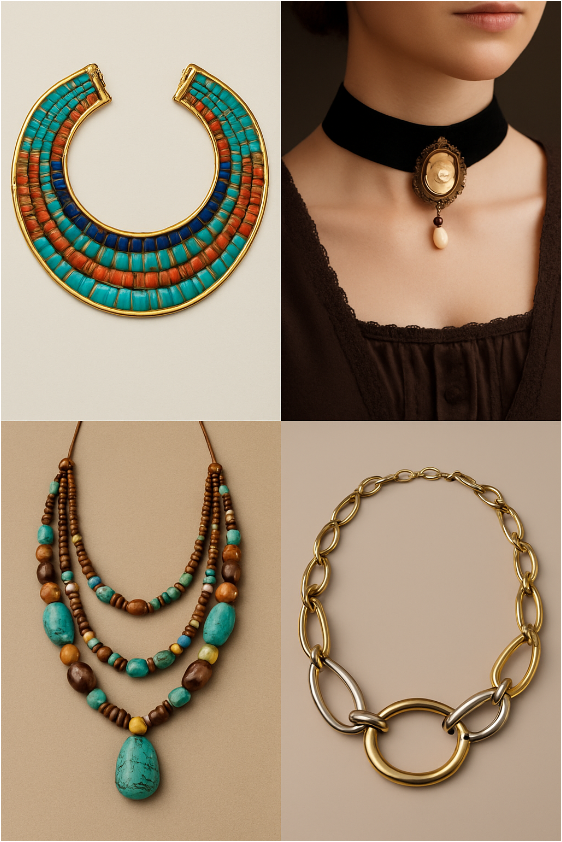 Art Nouveau and Art Deco – nature versus modernityArt Nouveau (c. 1895–1905)The Art Nouveau movement rejected industrial mass production and embraced organic forms. Jewelry designers like René Lalique created long, sinuous necklaces inspired by flowers, insects and the female form. Semi‑precious stones such as malachite, chrysoprase, lapis and moonstone were favoured over diamonds, while transparent enamel techniques like plique‑à‑jour created stained‑glass effects. Wider necklines in fashion allowed for dramatic, cascading necklaces; these pieces celebrated nature and femininity. Art Deco (1920s–1930s)After the First World War, society embraced modernity. The Art Deco style introduced geometric patterns, symmetry and bold contrasts influenced by ancient Egypt, Aztec motifs and the machine age. Long sautoir necklaces with tassels and flapper‑style pendants complemented the sleek silhouette of 1920s dresses. Jewelers used platinum, diamonds and coloured gemstones arranged in streamlined designs to convey elegance and luxury. Costume‑jewelry companies also produced affordable versions with colourful enamel so that women of different classes could partake in the trend. Mid‑20th Century – pearls and glamourThe post‑war 1950s emphasised conservative femininity. Short strands of pearls epitomised the ideal woman; first lady Jackie Kennedy helped popularise the look. Pearls were paired with modest necklines for day wear, while long ropes of pearls draped over evening gowns signalled sophistication. Rhinestones and gold returned to evening jewelry as economic prosperity increased. By the 1970s, however, fashion rebelled against these polished norms. The 1970s – bohemian freedom and disco flashThe 1970s celebrated individuality and cultural fusion. Bohemian style incorporated natural materials such as wood, shells, bone and turquoise; wearers layered necklaces of varying lengths to create eclectic combinations. Turquoise, in particular, evoked Native American jewelry and the era’s fascination with the natural world. The decade also saw the rise of disco and hip‑hop culture—chunky gold chains and oversized pendants appeared on dance floors and album covers. Social movements like Black Power influenced motifs, inspiring afro picks and symbols of resistance in jewelry design.